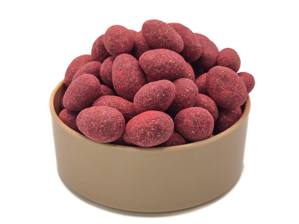 Mám tu mandle údené, mandle slané, mandle v cukre, mandle v jahodách....a tak som si všimla, že mi vo vrecúšku malín sušených mrazom, ktorý som práve jedla, zostal len malinový prach, a nápad bol na svete.