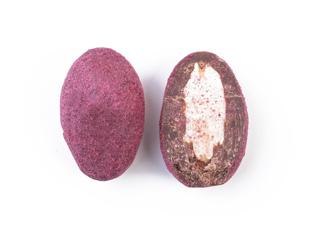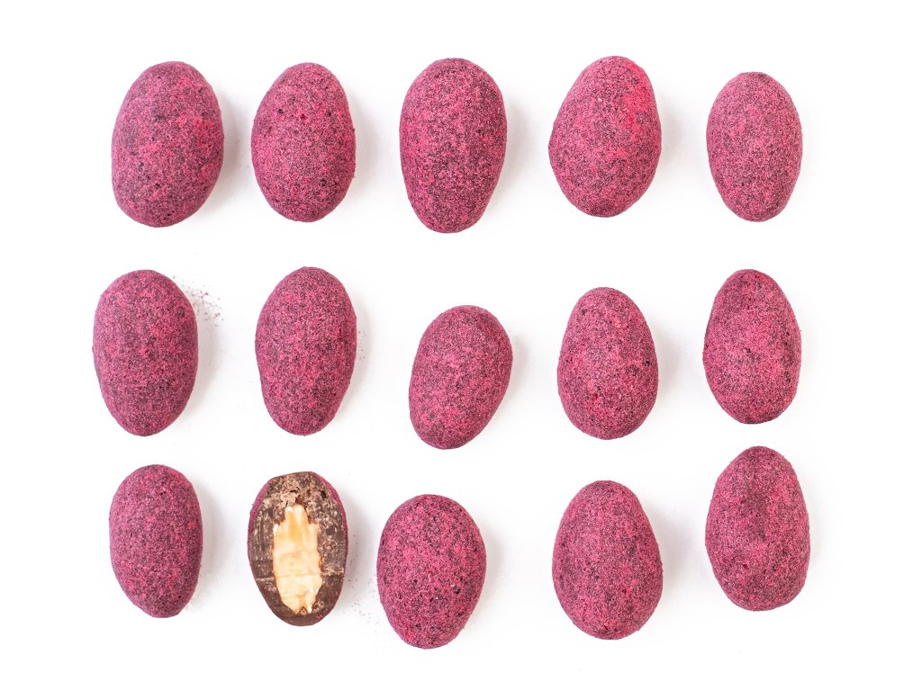 Mám tu mandle údené, mandle slané, mandle v cukre, mandle v jahodách....a tak som si všimla, že mi vo vrecúšku malín sušených mrazom, ktorý som práve jedla, zostal len malinový prach, a nápad bol na svete.