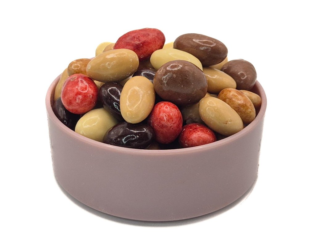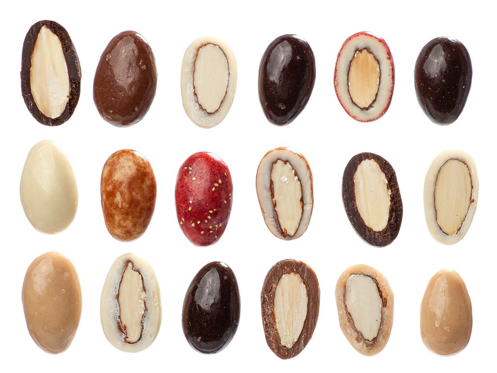 Sme veľká partia mandlí obalená do rôznych poliev. Pozri na mňa.