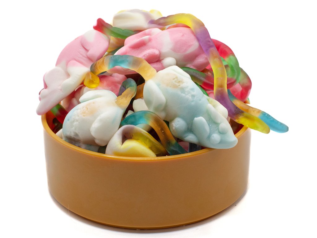 Zloženie: | glukózový sirup, cukor, bravčová želatína, kyseliny: kyselina citrónová, kyselina mliečna; želirujúca látka: pektíny; arómy, potravinové farbiva: kurkuma, červená redkvička, červené hrozno, svetlica farbiarska, čerešňa); farbivo: karmín, kurkumín, brilantný modř FCF, leštiace látky: včelí vosk, biely a žltý, karnaubský vosk. |