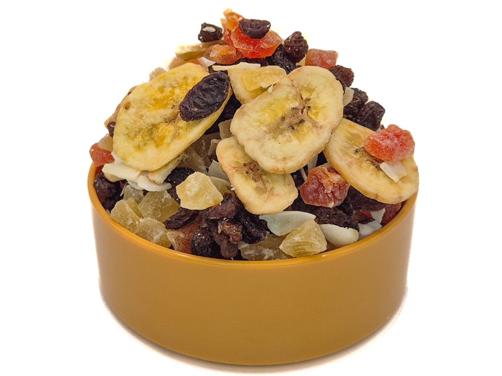 Pre všetkých milovníkov ovocia, ktorí sú nerozhodní! Najlepší kokosový a banánový chips osladený medom, ananásové a papájové kocky a samozrejme hrozienka.