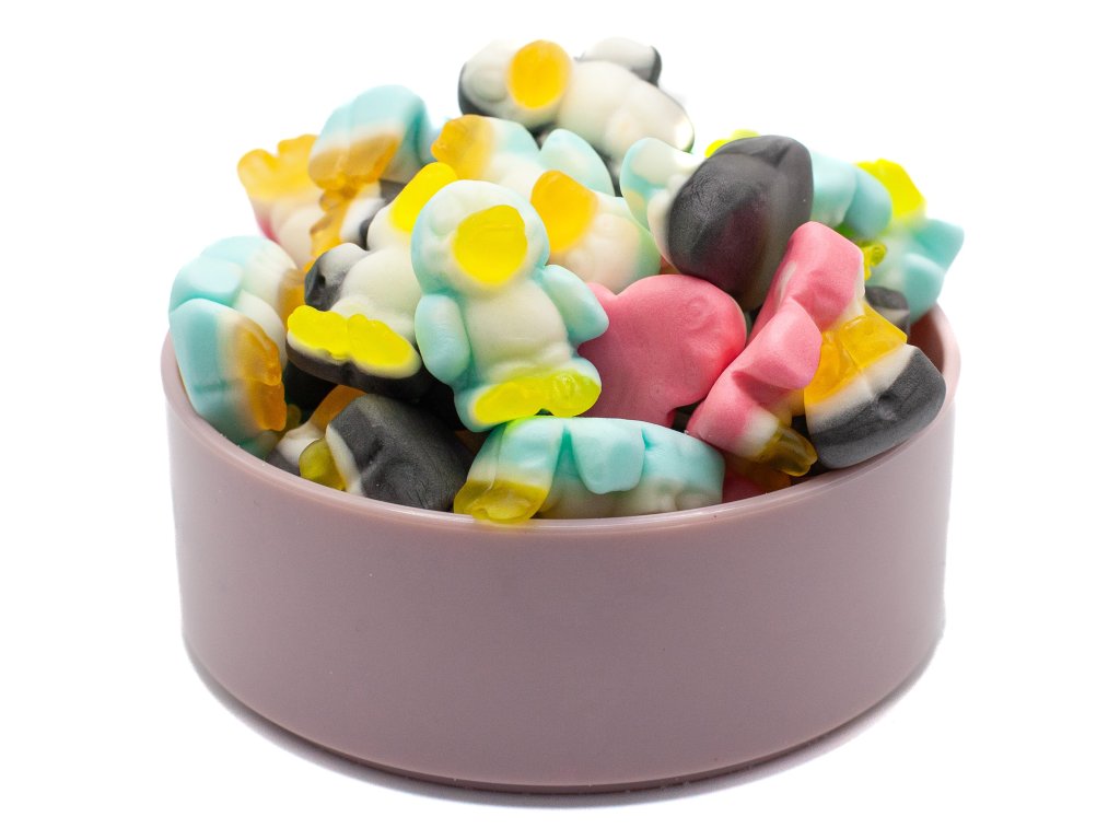 Zloženie: | glukózový sirup, cukor, želatina, kyseliny: kyselina citrónová, kyselina mliečna; želírujíca látka: pektíny; arómy, potravinové farbiva: kurkuma, červená reďkovka, červené hrozno, svetlica farbiarska, čerešňa); farbivo: karmín, kurkumin, brilantní modrá FCF, leštiace látky: včelí vosk, biely a žltý, karnaubský vosk. |